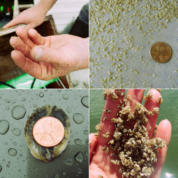 Late spring we receive tiny oysters (1.5mm), known as seed, from hatcheries around the northeast coast. A package with 1 million oysters will weigh roughly two pounds. Eighteen months later, when they reach market size, the same number could weigh up to eighty thousand pounds. Upon receiving seed, these babies are immediately put into our upweller system for the nursery phase of growing.